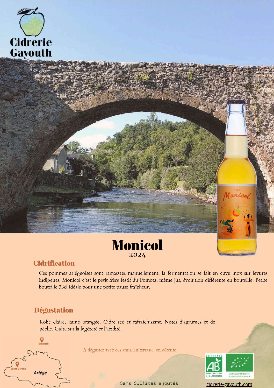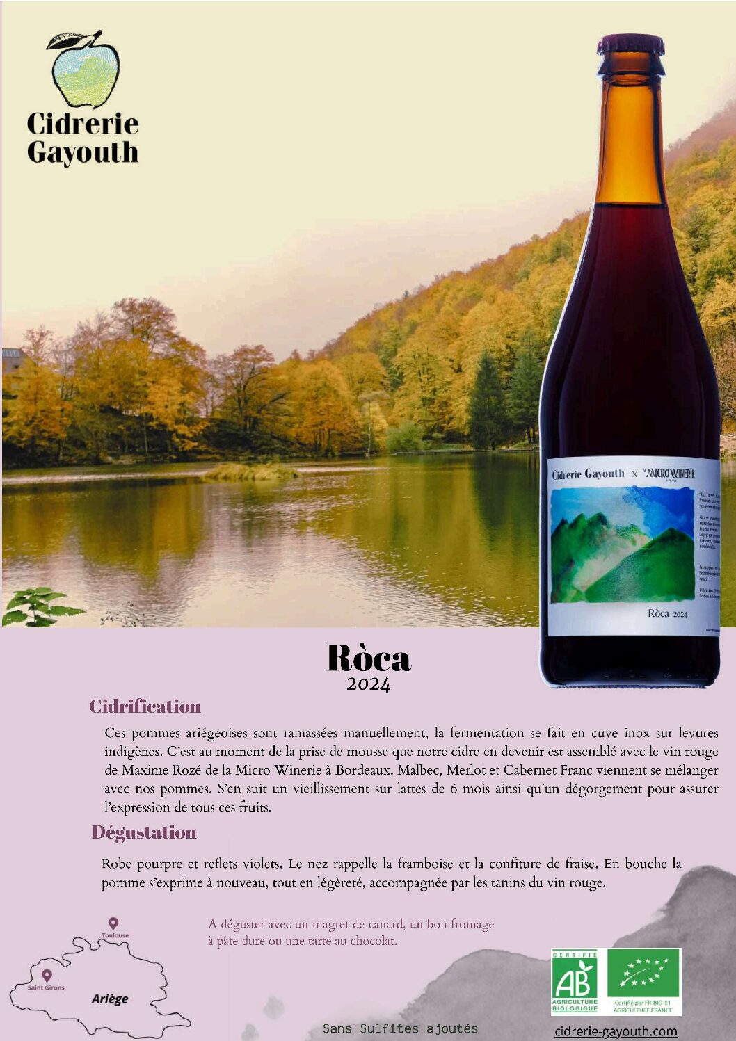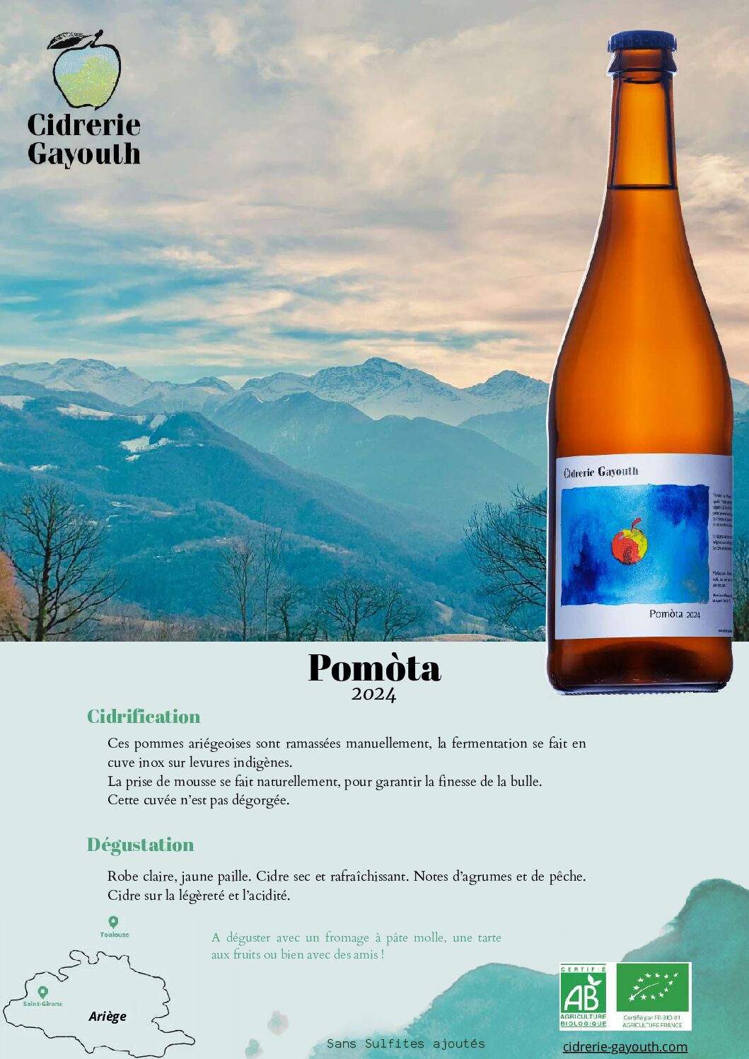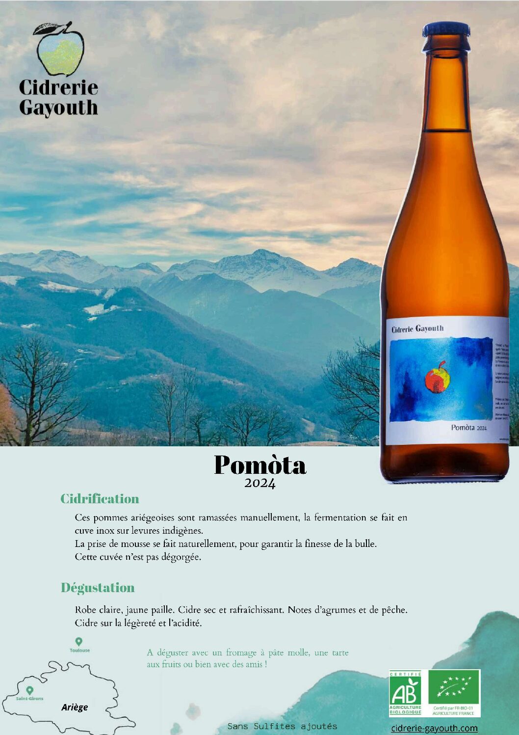 Découvrez au cœur de la vallée de Bethmale des cidres authentiques et naturels. La cidrerie Gayouth cherche à découvrir le profil des cidres que peuvent nous offrir les pommes présentes en Ariège, en privilégiant une fermentation via levures indigènes. Ici pas de pasteurisation ni de gaz carbonique, la prise de mousse (fermentation en bouteille qui crée l’effervescence du cidre) est naturelle et se fait en bouteille.